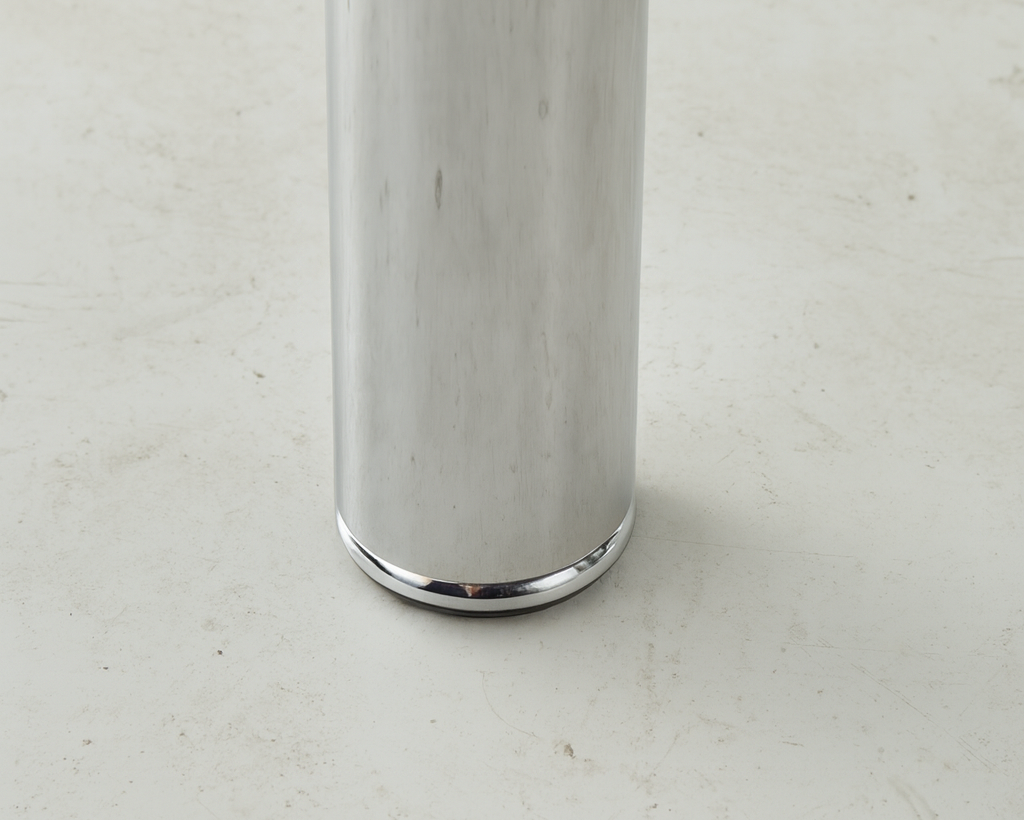 Die massiv verarbeitete Glasplatte mit sanft abgerundeten Kanten trifft auf hochwertig galvanisch beschichtete Metallbeine in Silber – für eine gleichmäßige, langlebige Oberfläche. Höhenverstellbare Füße sorgen für sicheren Stand auch auf unebenen Böden. Dank seiner ausgewogenen Proportionen fügt sich der Glastisch harmonisch in moderne Interieurs ein.